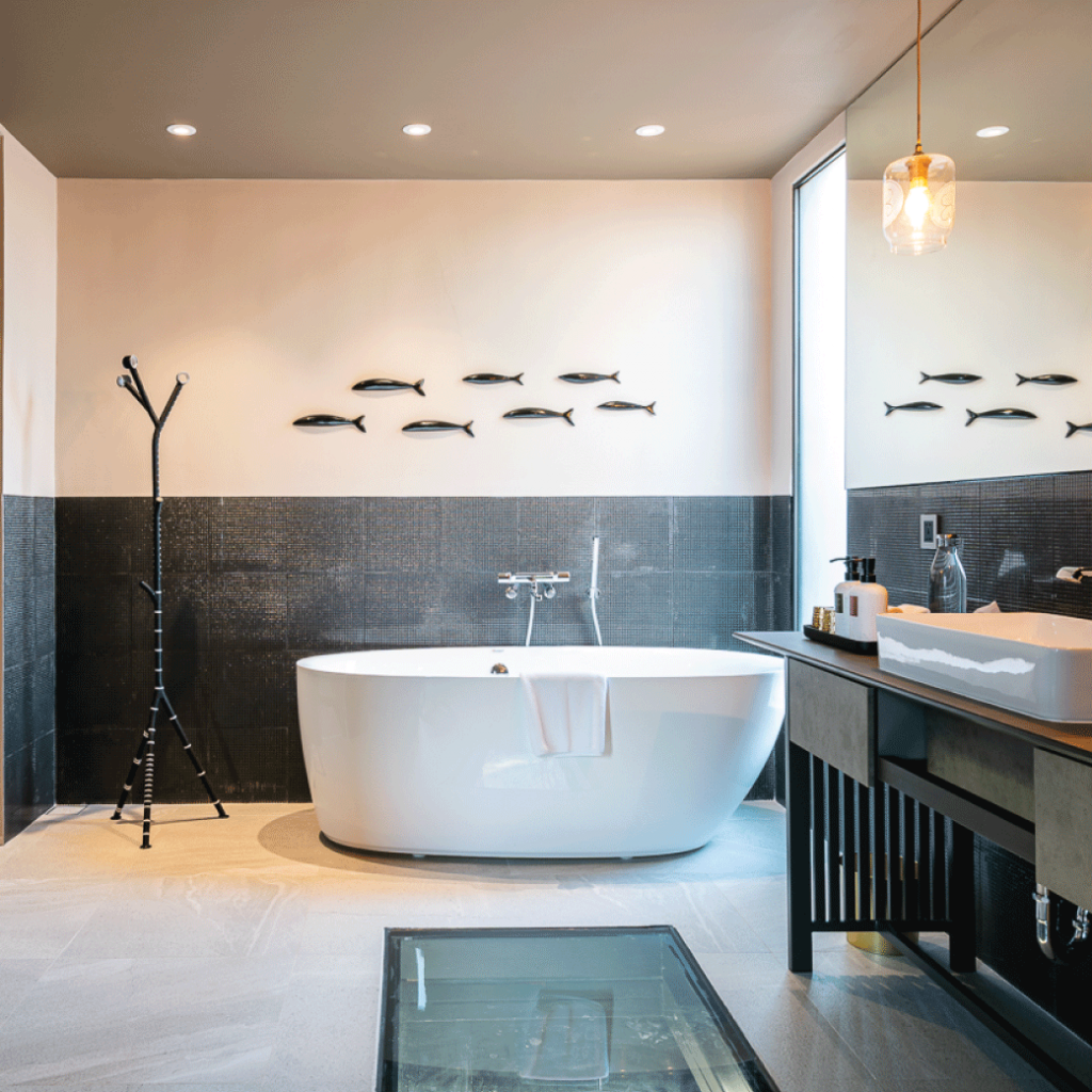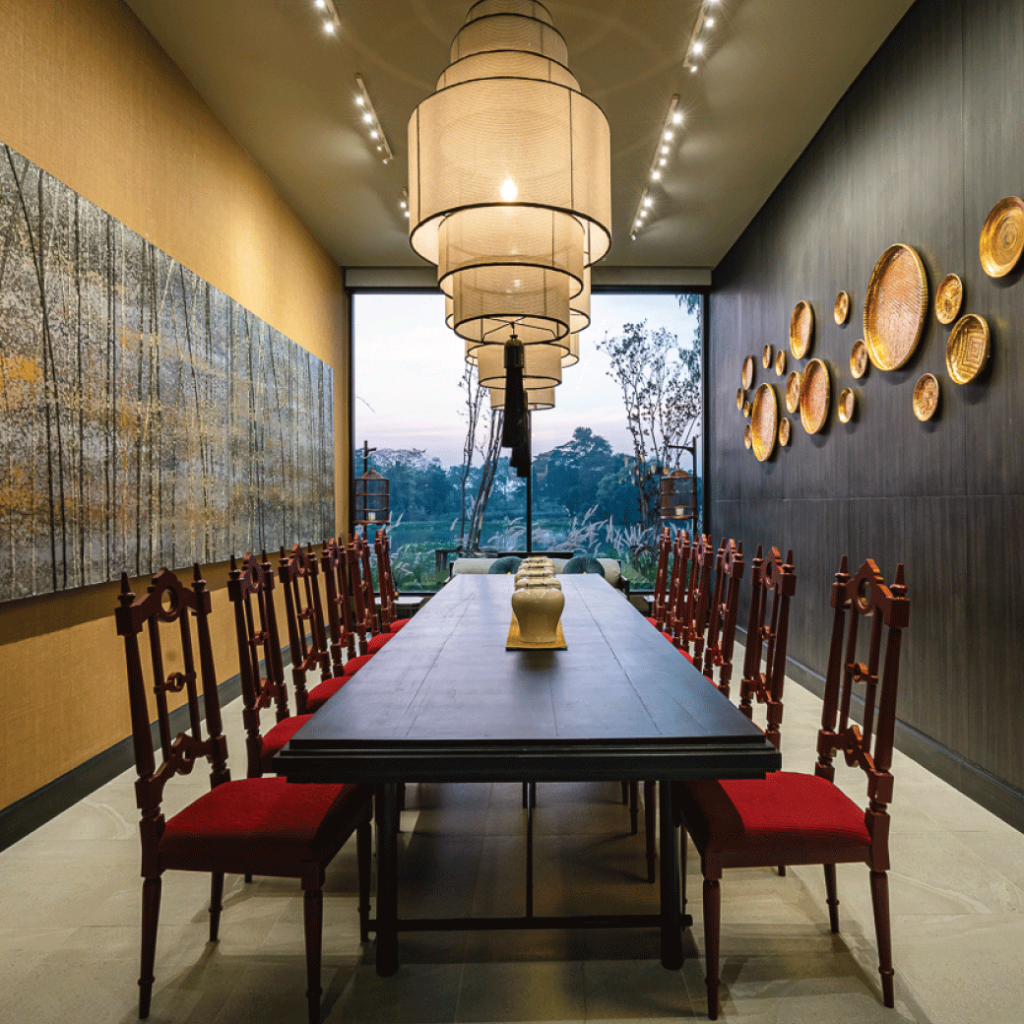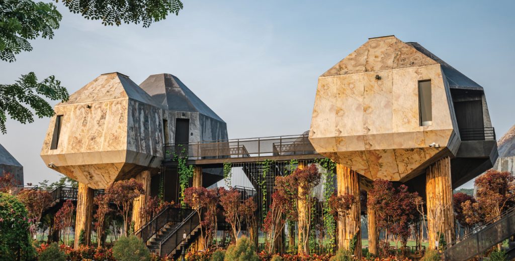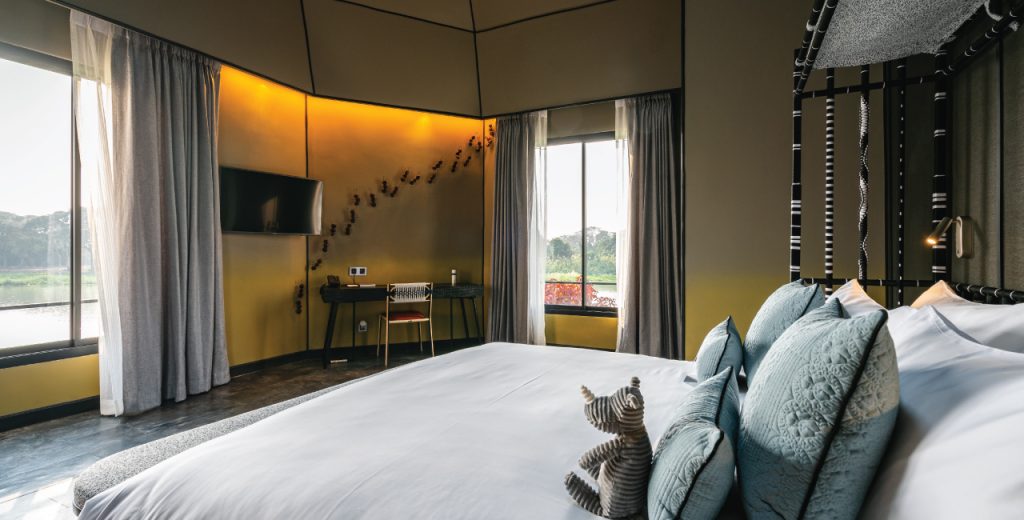 ภายในห้องพักมีสิ่งอำนวยความสะดวกครบครัน มีโซฟา โต๊ะทำงาน มินิบาร์ในห้องพักทานได้ฟรีทั้งขนมขบเคี้ยว, น้ำผลไม้, ผลไม้กระป๋อง, infused water ชา และกาแฟ เพดานสูงโปร่งให้ความรู้สึกโล่งสบาย มองออกไปก็เห็นแม่น้ำไหลเอื่อย เย็นตาสบายใจ ตกแต่งอย่างมีรสนิยมผสมผสานกับแนวคิดความกลมกลืนกับธรรมชาติ ภายใต้สิ่งอำนวยความสะดวกที่ครบครัน หลังคาของบ้านต้นไม้จะมีดีไซน์พิเศษอย่างหนึ่งคือจะมีกระจกใสที่เป็นช่องแสงส่องผ่านลงมาได้ เป็นความตั้งใจของทางรีสอร์ทที่ต้องการให้ผู้เข้าพักตื่นยามเช้า ด้วยการใช้แสงสว่างธรรมชาติปลุก เพื่อออกมาสูดอากาศในยามเช้า ห้องแต่งตัวกว้างมาก มีพื้นกระจกมองเห็นต้นไม้ที่ปลูกไว้ใต้ถุนบ้าน มีห้องอาบน้ำ ห้องน้ำที่ชักโครกมีระบบอัตโนมัติแบบญี่ปุ่น และมีอ่างอาบน้ำเช่นกัน